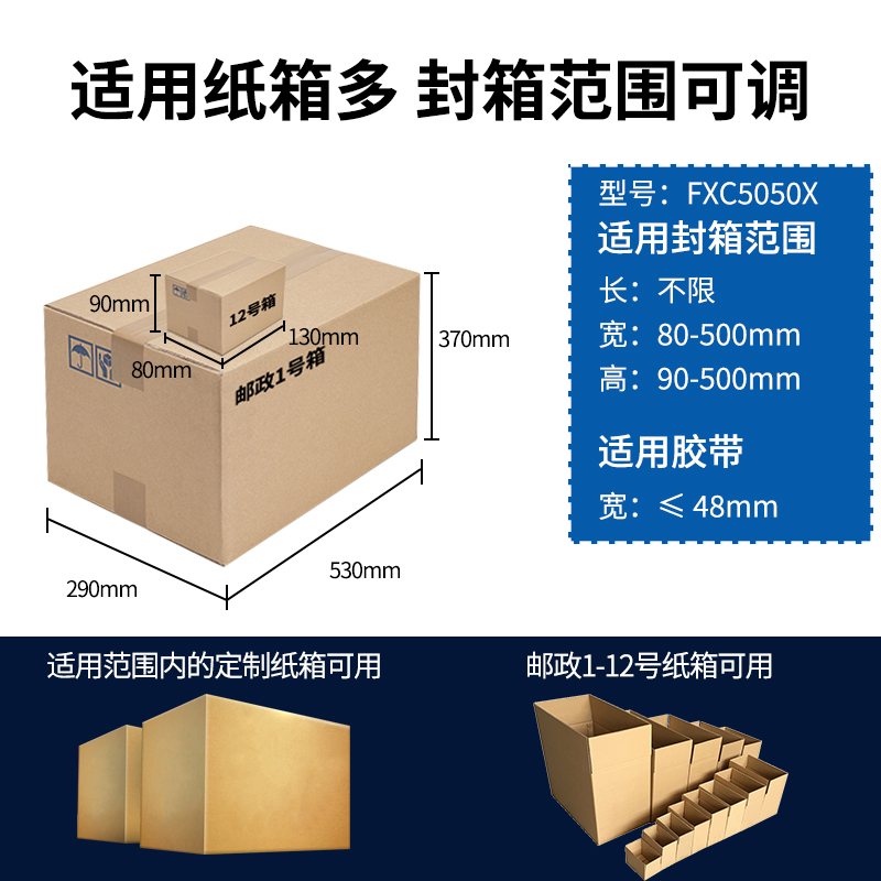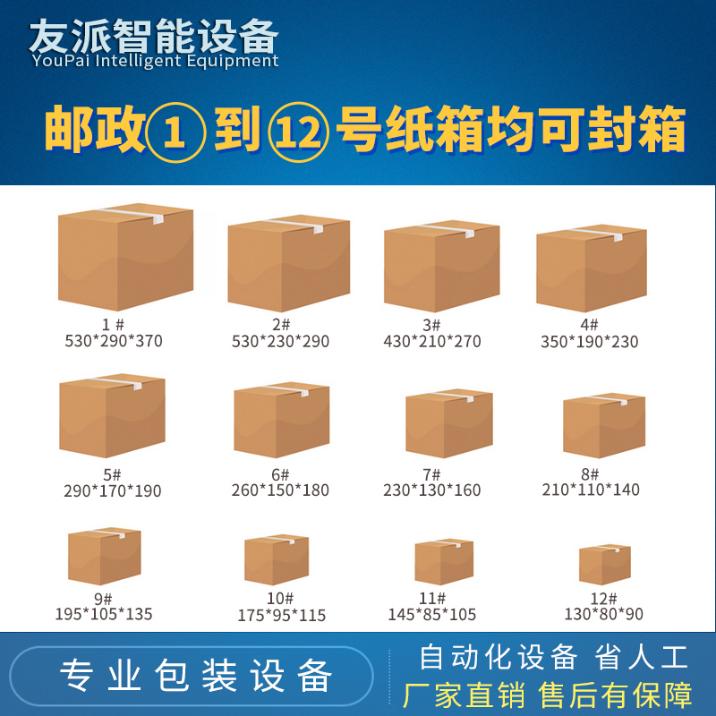 友派FXC5050X郵政小紙箱封箱機(jī)專門(mén)為電商行業(yè)設(shè)計(jì)研發(fā),郵政紙箱1號(hào)-12號(hào)都能適用。不用調(diào)整機(jī)器就可以打包,該機(jī)屬機(jī)械式結(jié)構(gòu),部分采用進(jìn)口零件,后刀刃穩(wěn)定可靠,調(diào)整方便等特點(diǎn)。...