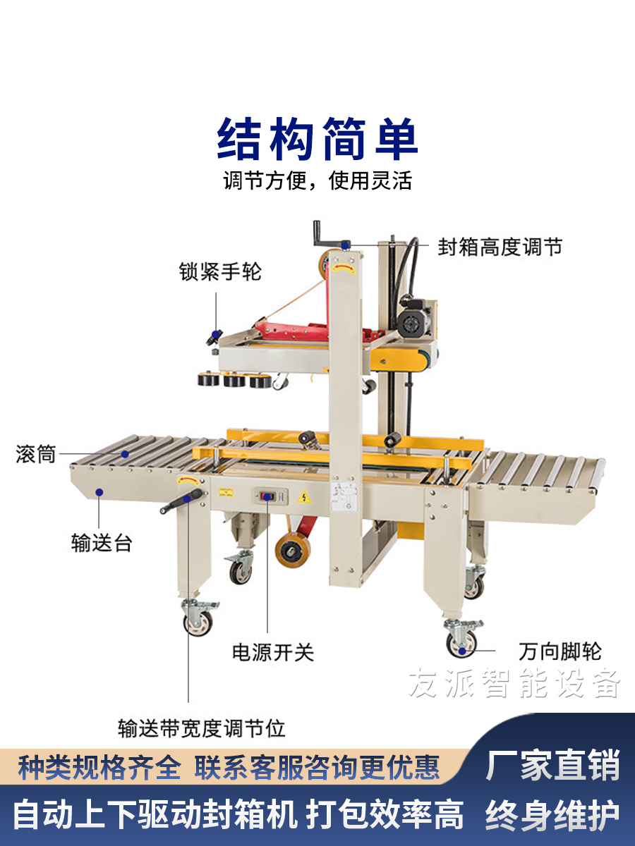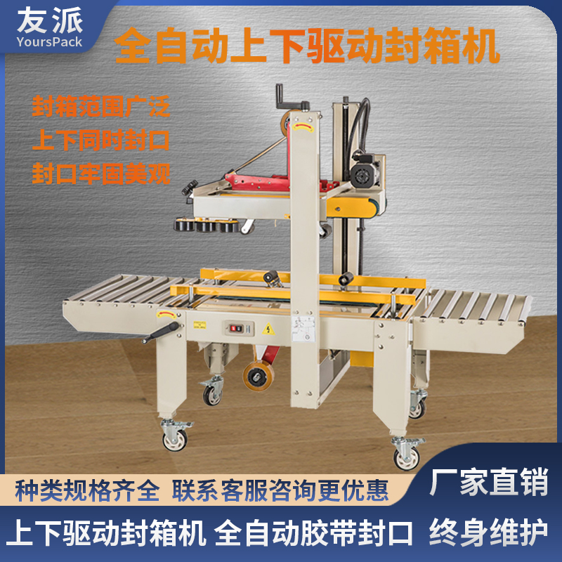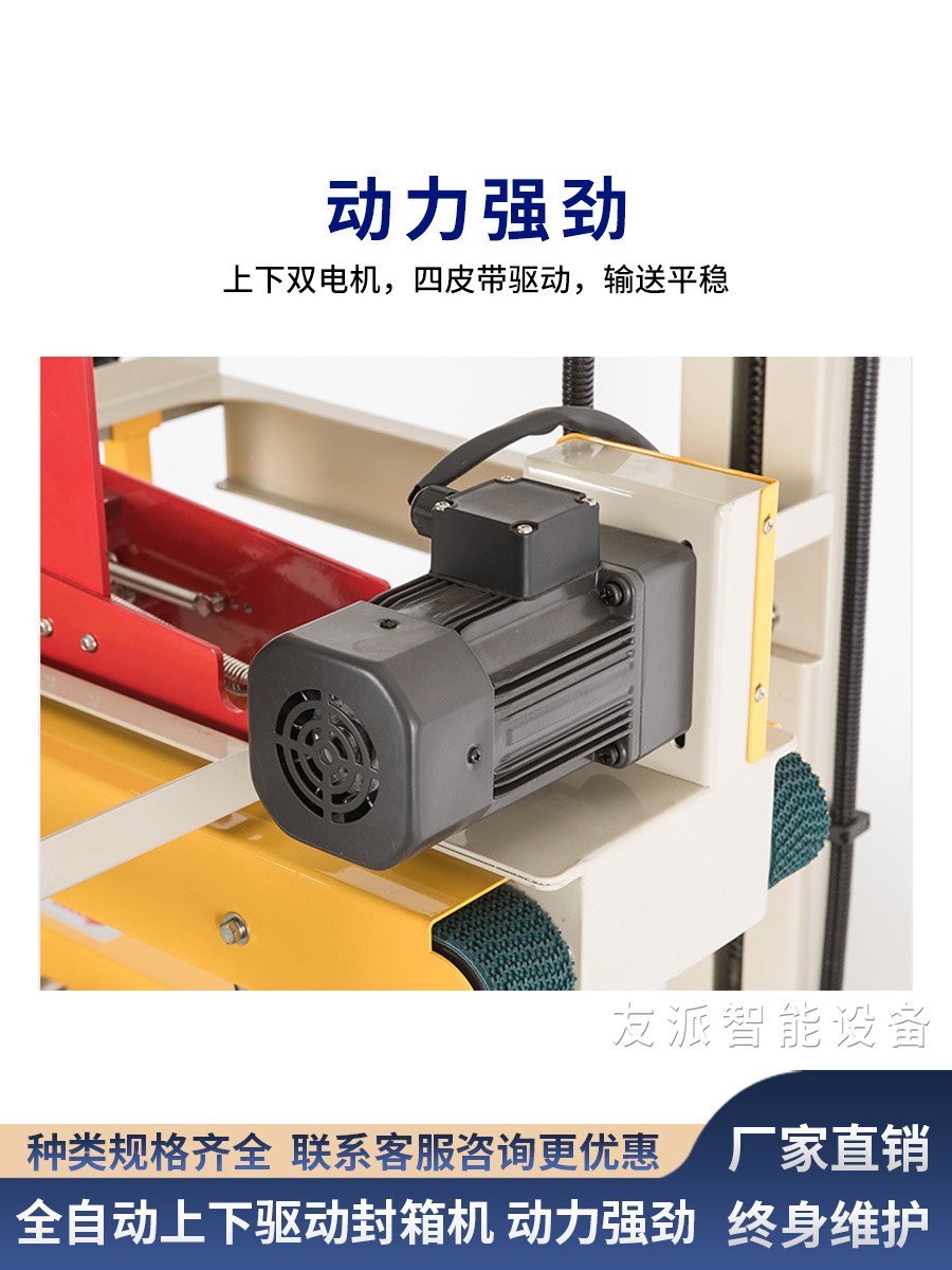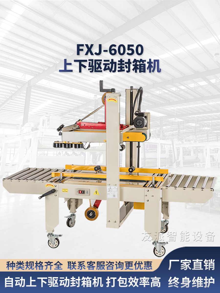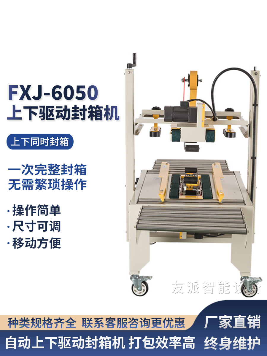 友派FXJ6050全自動上下驅(qū)動封箱機(jī),上下雙電機(jī),四皮帶驅(qū)動,動力強(qiáng)勁,適合大紙箱使用。...